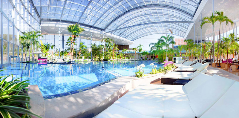 Aufgeteilt in 3 Badebereiche – das Spaßbad Galaxy / das Erholungsbad Palmenoase / die Wellnessoase – bietet es für jeden etwas. 300 Palmen, 60.000m², 1.200m
